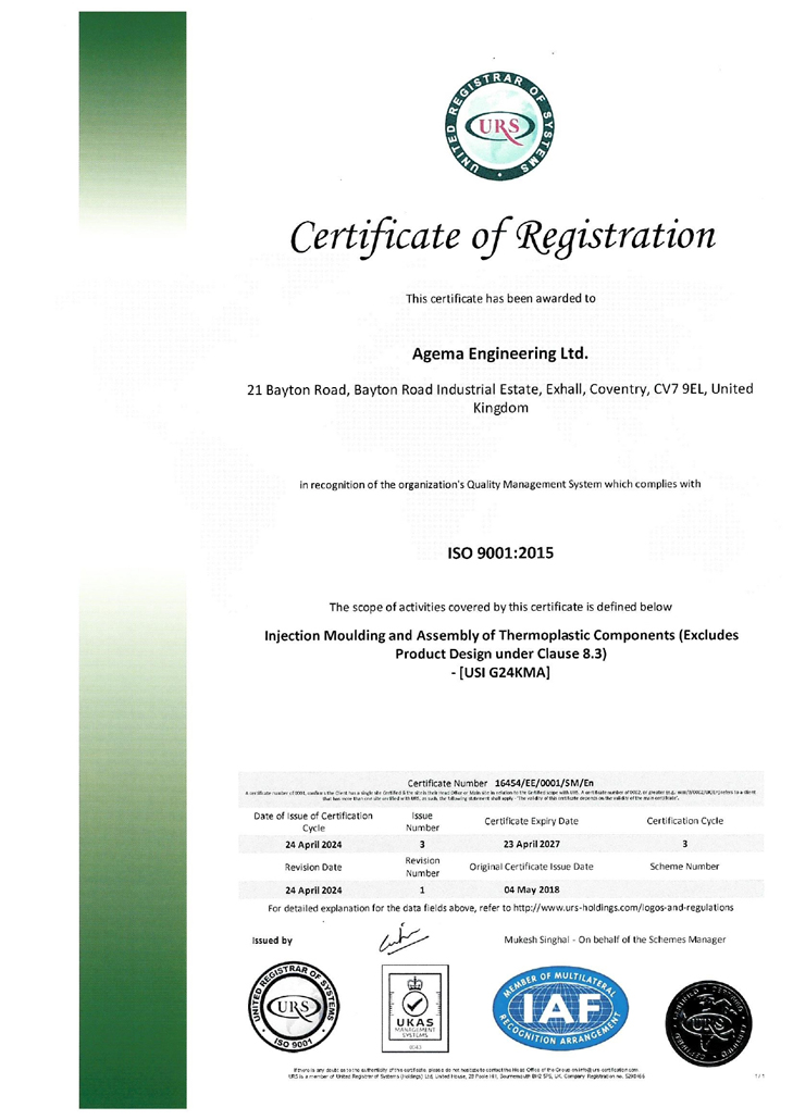 Agema Engineering is IATF 16949:2016 certified as well as ISO 9001:2015 and ISO 14001:2015. We have also been accredited to Q1 / JLRQ for nearly 20 years.